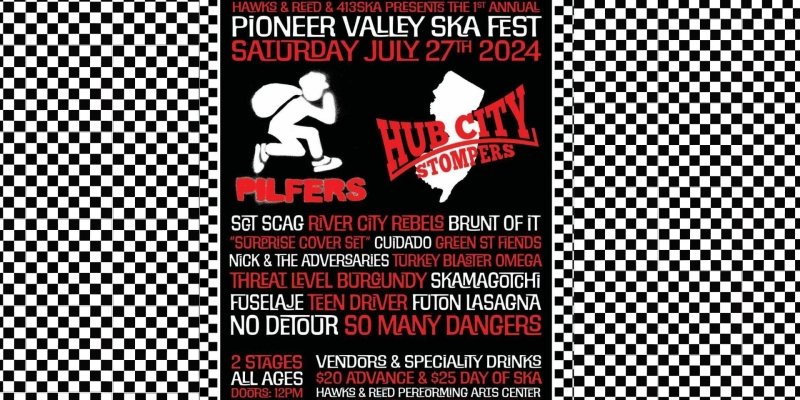 July 27, 2024 - 1pm - 11:30 pm Pioneer Valley Ska Fest Presented by Hawks & Reed $20-$25 Hawks & Reed BallroomDoors Open at 12pm All Ages July 27, 2024 - 1:00 pm Pioneer Valley Ska Fest