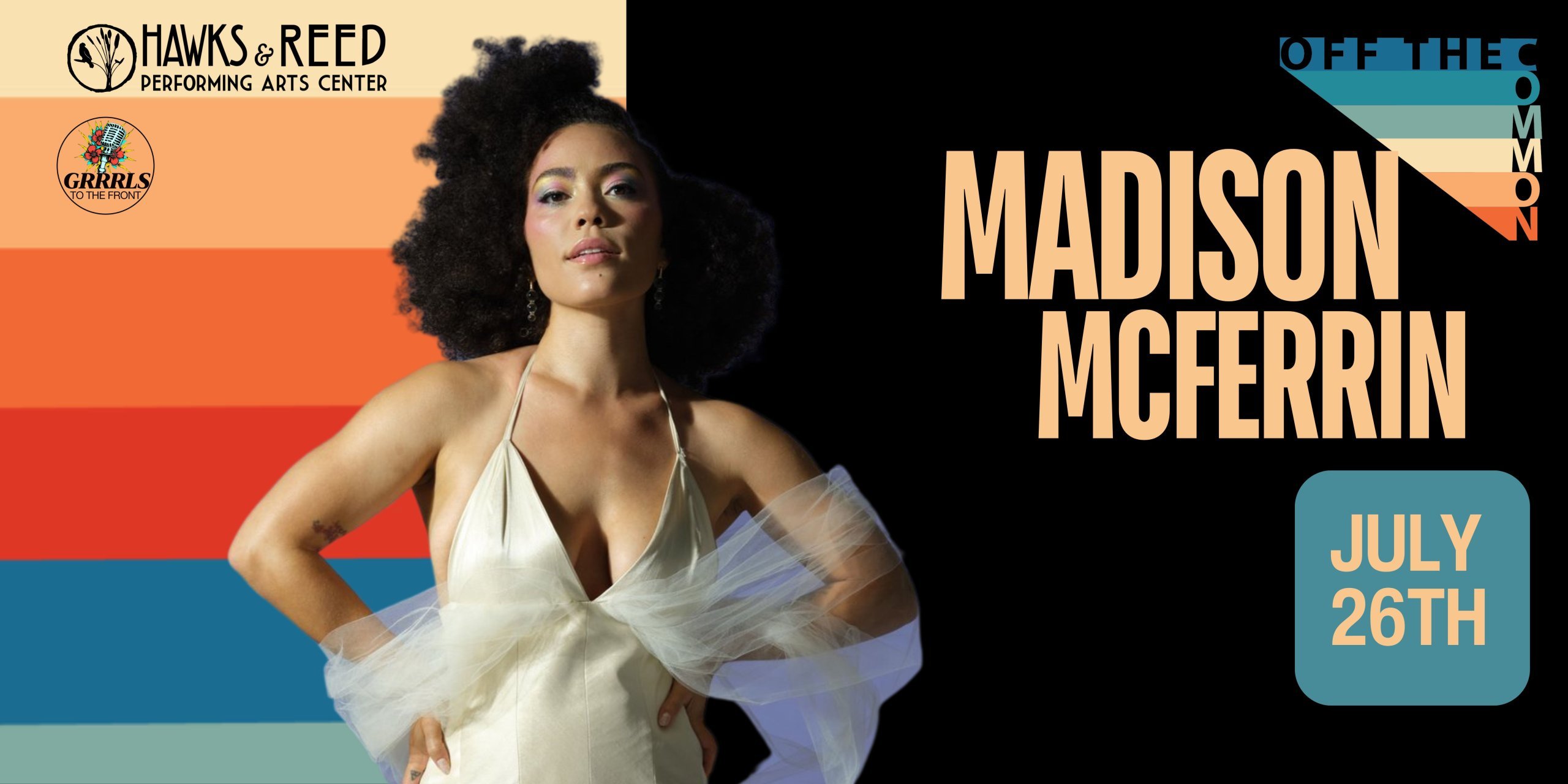 July 26, 2024 - 5pm - 11pm OFF THE COMMON – A Free Summer Concert Series July Edition Presented by Hawks & Reed Donations Appreciated Hawks & Reed Ballroom All Ages July 26, 2024 - 5:00 pm OFF THE COMMON – A Free Summer Concert Series July Edition