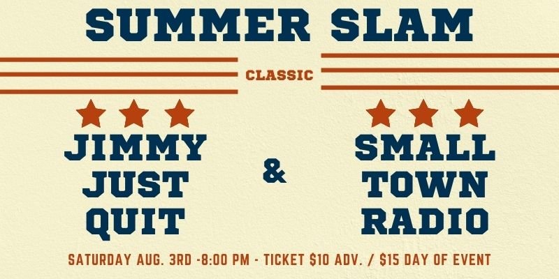 August 3, 2024 - 8pm - 12:30 am SUMMER SLAM: Jimmy Just Quit & Small Town Radio Presented by Hawks & Reed $10 - $15 Hawks & Reed BallroomDoors Open at 7:30 pm All Ages August 3, 2024 - 8:00 pm SUMMER SLAM: Jimmy Just Quit & Small Town Radio