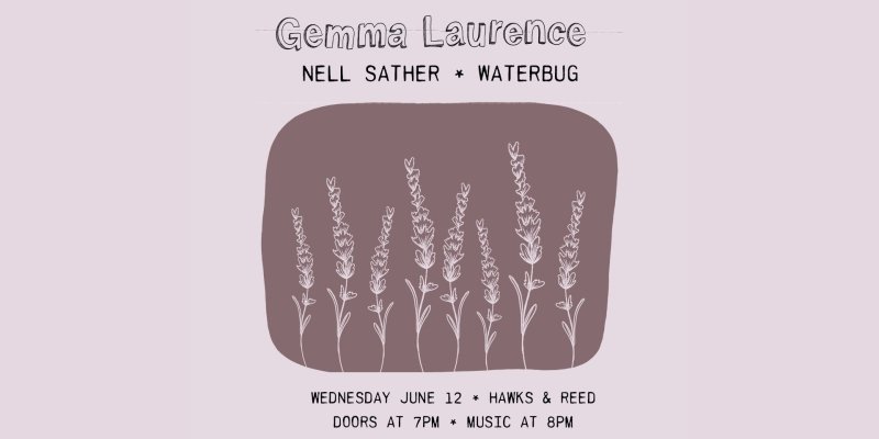 June 12, 2024 - 8pm - 11:30 pm Gemma Laurence, Waterbug, & Nell Sather Presented by Hawks & Reed $10-$15 Hawks & Reed BallroomDoors Open at 7pm All Ages June 12, 2024 - 8:00 pm Gemma Laurence, Waterbug, & Nell Sather