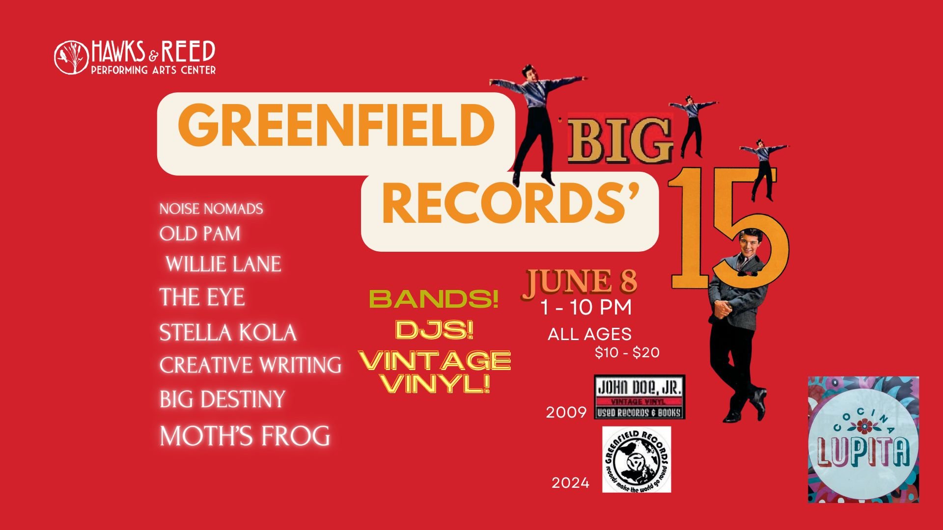 June 8, 2024 - 1pm - 10pm Greenfield Records Big 15th! Presented by Hawks & Reed $15-$20 (Sliding Scale) Hawks & Reed BallroomDoors Open at 12:30 pm All Ages June 8, 2024 - 1:00 pm Greenfield Records Big 15th!