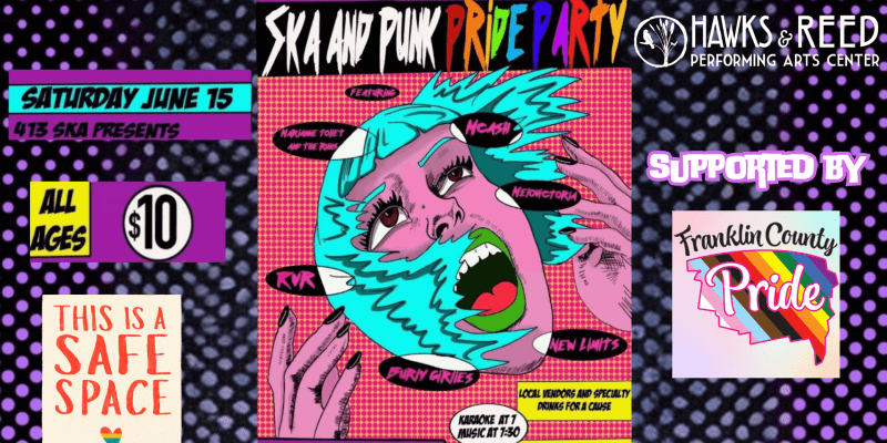 June 15, 2024 - 7pm 413Ska Presents: A Ska & Punk Pride Party at Hawks & Reed Presented by Hawks & Reed $10 Hawks & Reed Ballroom All Ages June 15, 2024 - 7:00 pm 413Ska Presents: A Ska & Punk Pride Party at Hawks & Reed