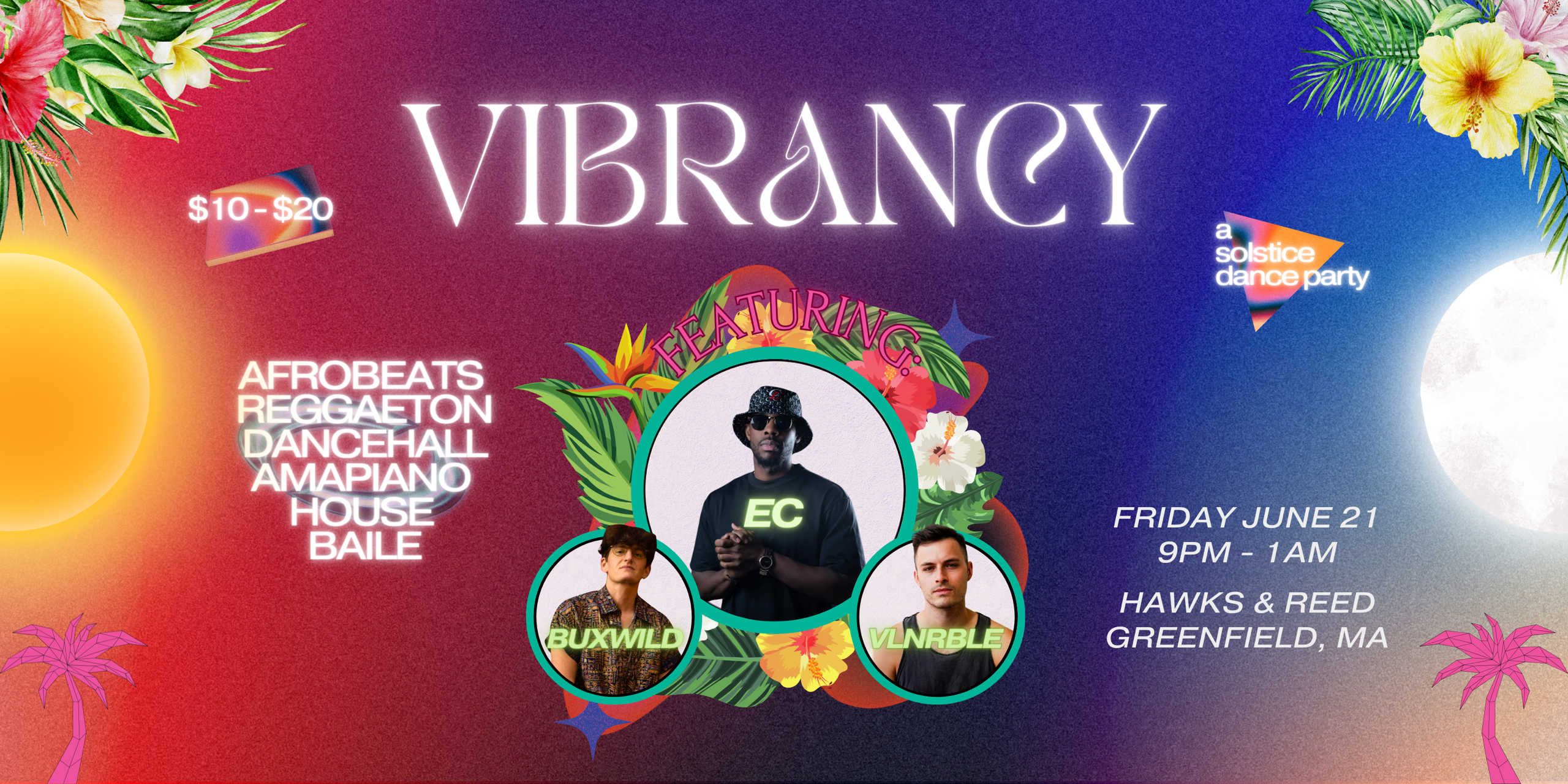June 21, 2024 - 9pm - 1am VIBRANCY – A Solstice Dance Party Presented by Hawks & Reed $10-$20 Hawks & Reed Ballroom All Ages June 21, 2024 - 9:00 pm VIBRANCY – A Solstice Dance Party